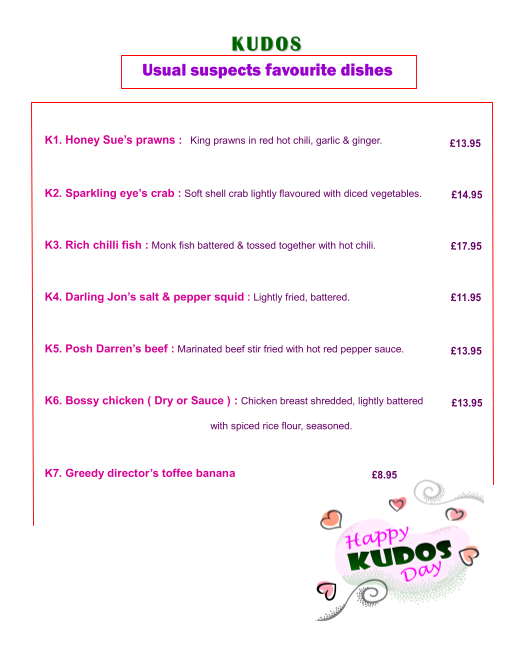 Welcome to Kudos Restaurant, a hidden gem nestled in the heart of Canterbury. Renowned for its exquisite take on traditional Chinese cuisine, Kudos elevates dining to an art form. The menu offers a harmonious blend of flavors, with standout dishes like the medium spicy salt & pepper squid, hailed as the best in Europe.